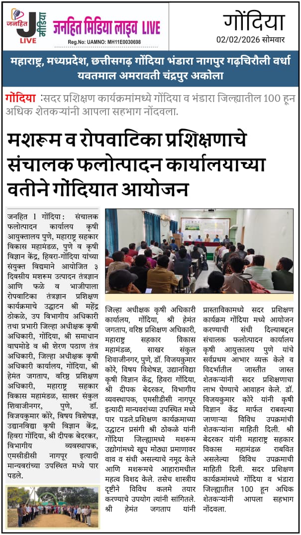 संचालक फलोत्पादन कार्यालय कृषी आयुक्तालय पुणे, महाराष्ट्र सहकार विकास महामंडळ, पुणे व कृषी विज्ञान केंद्र हिवरा-गोंदिया यांच्या संयुक्त विद्यमाने मशरूम व रोपवाटिका प्रशिक्षणाचे आयोजन |